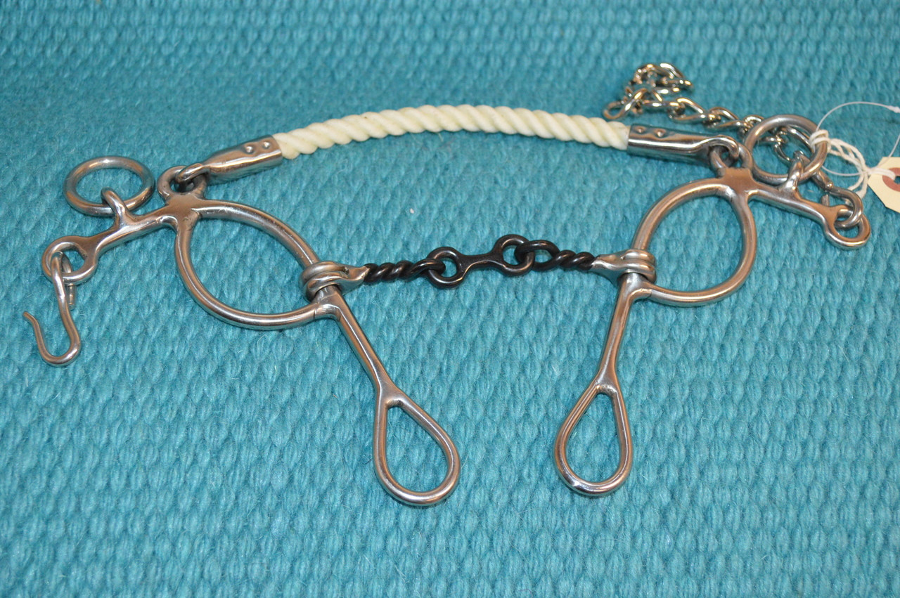Pony size 4 inch three piece rope nose barrel racing bit, with curb chain. Great for gaming or barrel racing hard to find size.