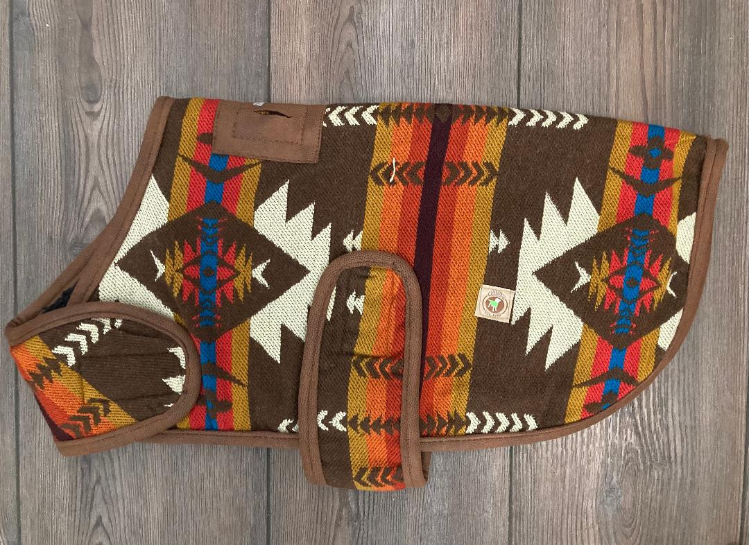 Chilly Dog Brand western style dog coat made in USA. Done in a brown southwestern or aztec design. Gorgeous coat to keep your best friend warm.