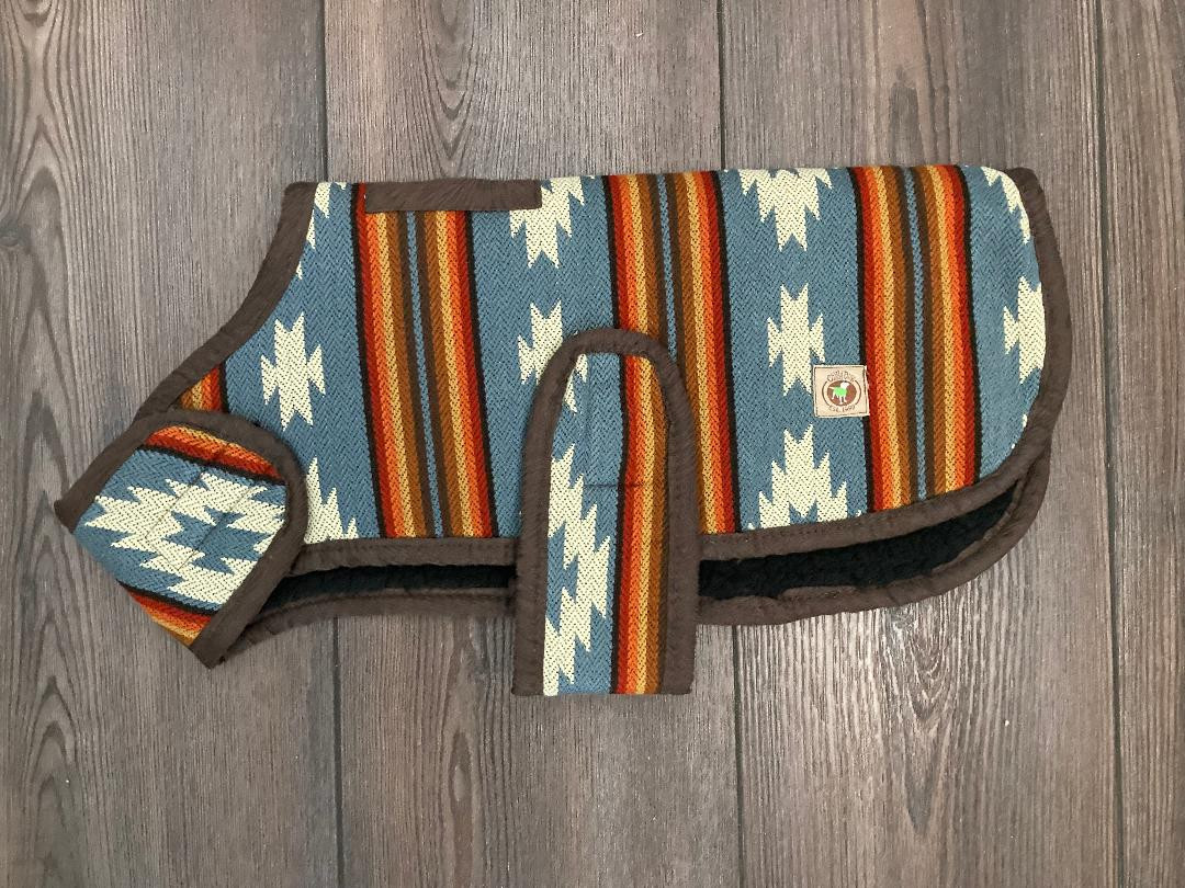 Chilly Dog brand dog coat handmade in USA. The pattern is done in a denim southwestern print, top opening for your leash to attach to the collar, Quality made.