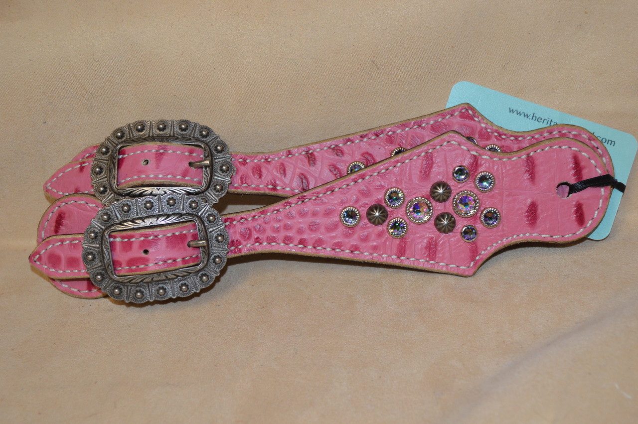 Heritage Brand handmade western spur straps. The leather is pink gator with clear Swarovski crystals with antiqued silver buckles.