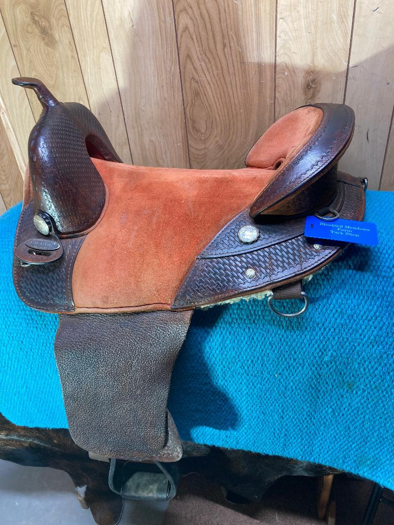 Hilason treeless Trail Saddle, preowned with a 17 inch seat, This saddle has the nice over flap over the stirrup leathers. Nice lite weight saddle will fit a wider horse nicely.