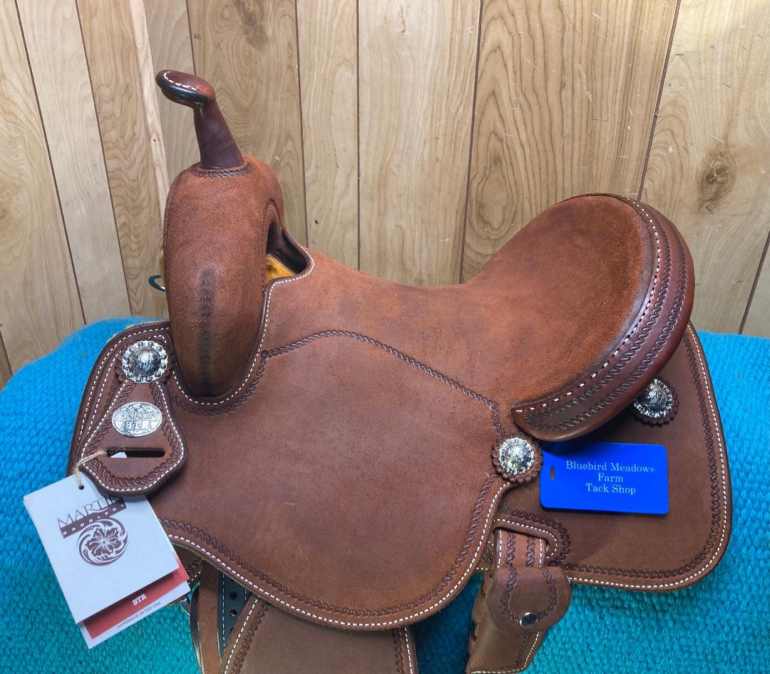 New Martin Saddlery BTR barrel racing saddle with a 14 inch seat, 7 inch gullet. The leather is all chocolate rough out accented with silver berry conchos, silver aluminum stirrups. This saddle with travel with up to the barrel shows may used as display model and have some dust when purchased online.