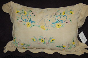 Western pillow by Tasha Polizzi palomio color leather nice and soft accented with beading horse head, hats and flowers. The size is approx. 12 by 20 inches plus the ruffle edge. Retails over 399.99. Great western décor gift.